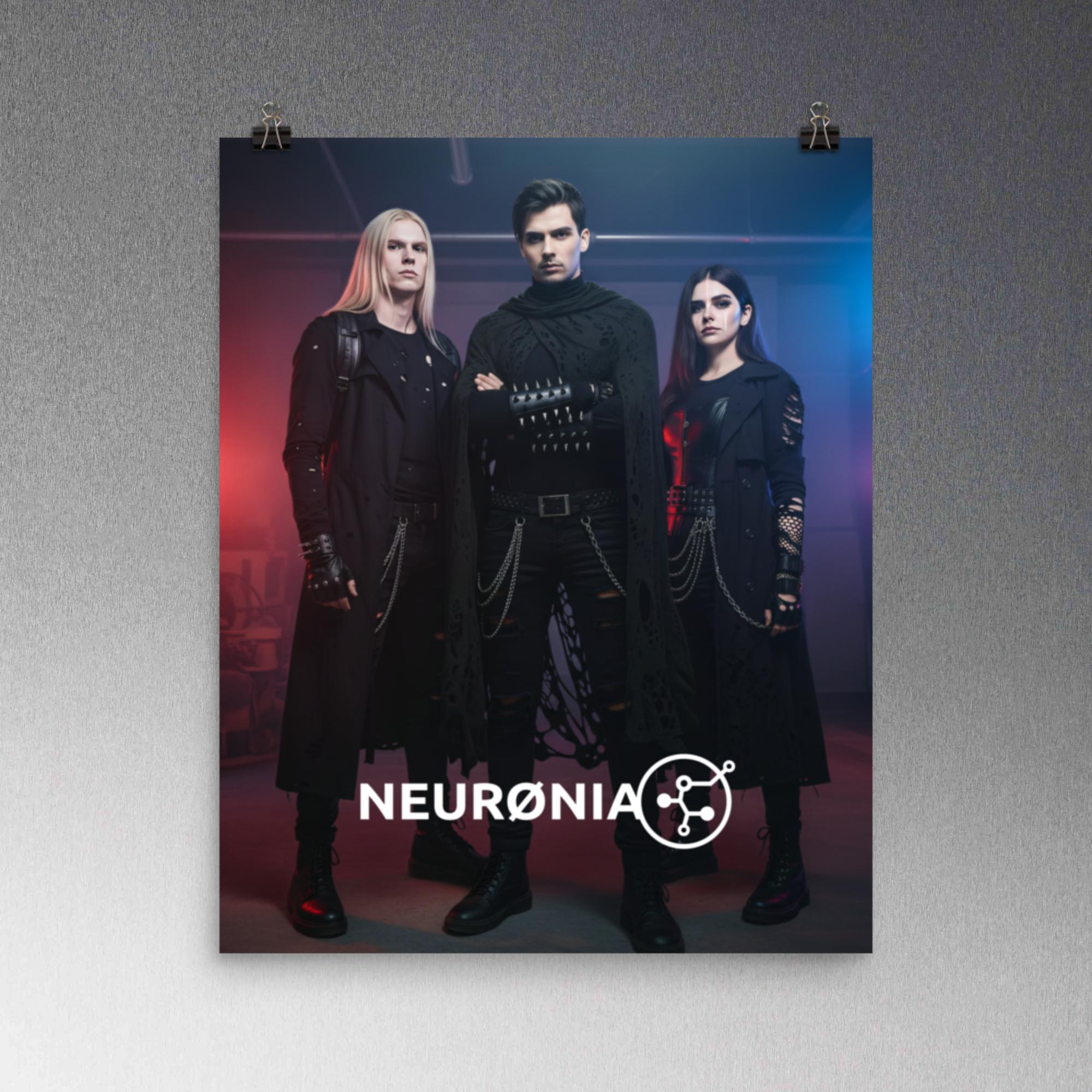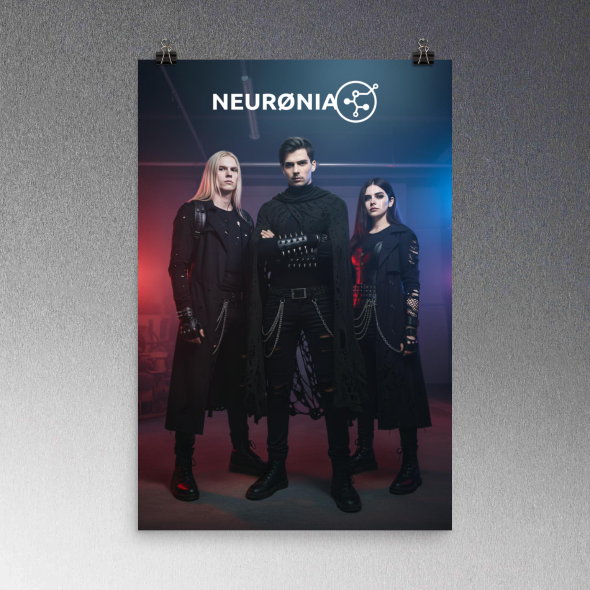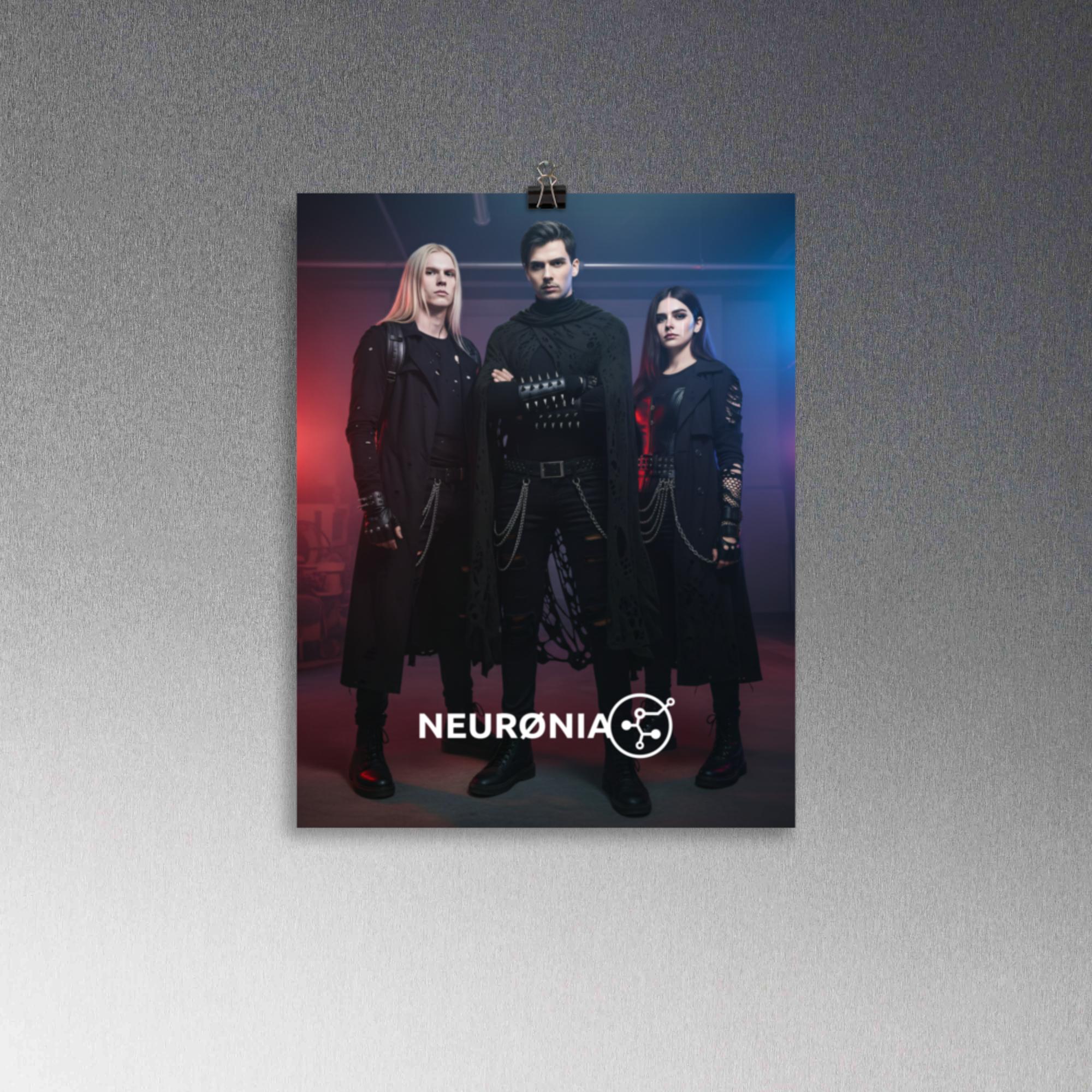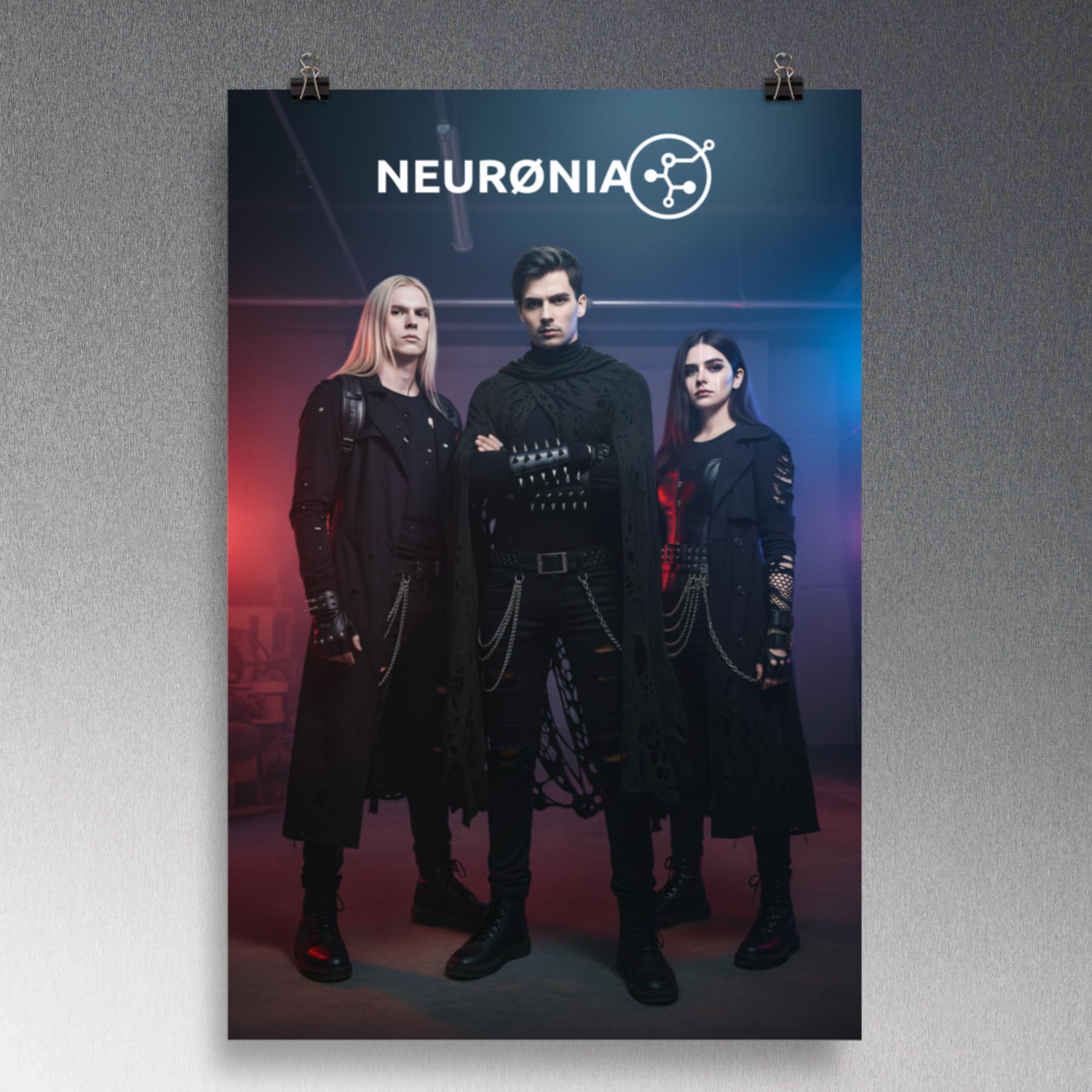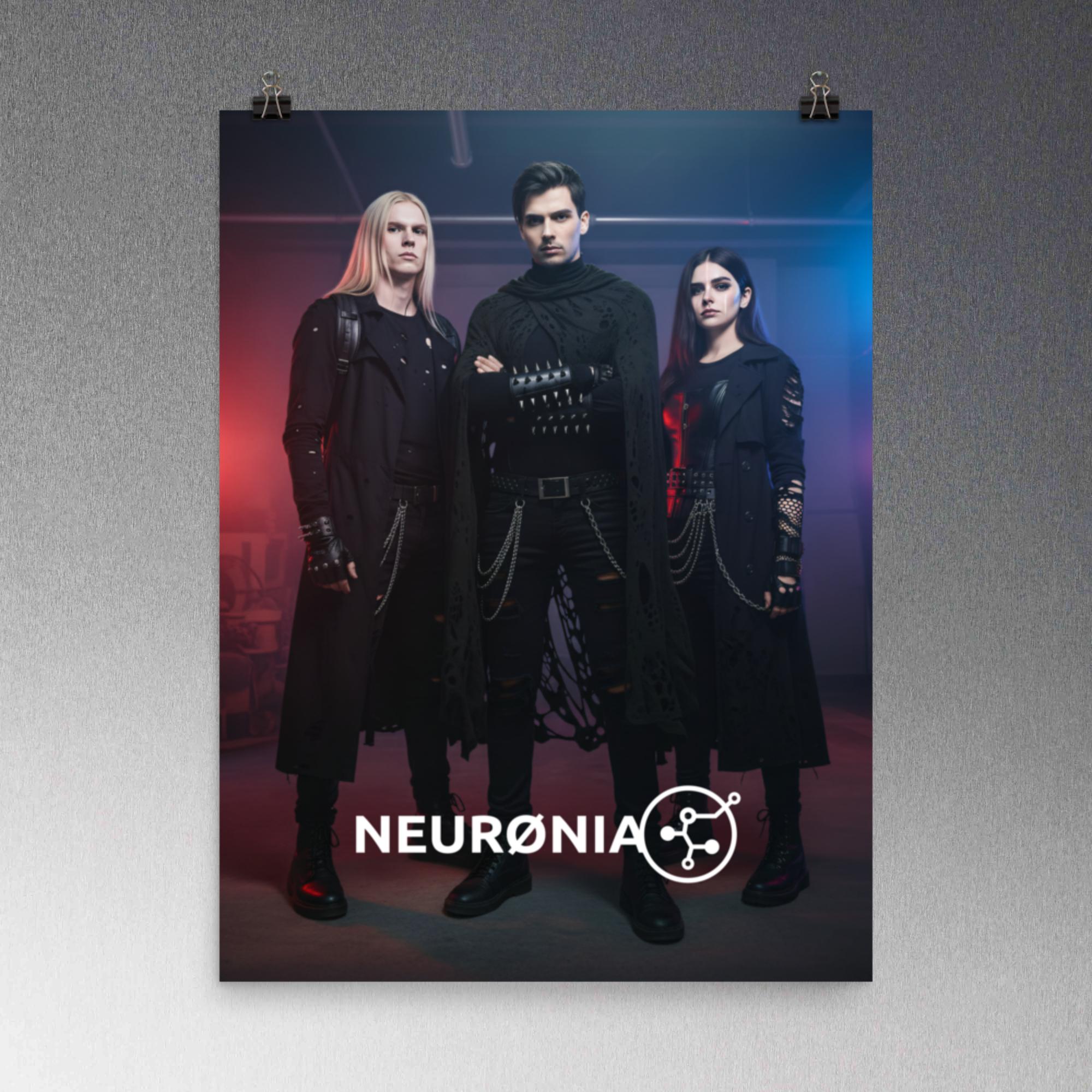 Three figures. One pulse. The Neuronia Band Poster unites Darian, Kael and Lyra— the heart of NEURØNIA — captured in their full presence: futuristic, and unbreakably focused. The image embodies the band’s essence — unity through contrast, light through shadow, and sound born from silence. A striking centrepiece for any wall.