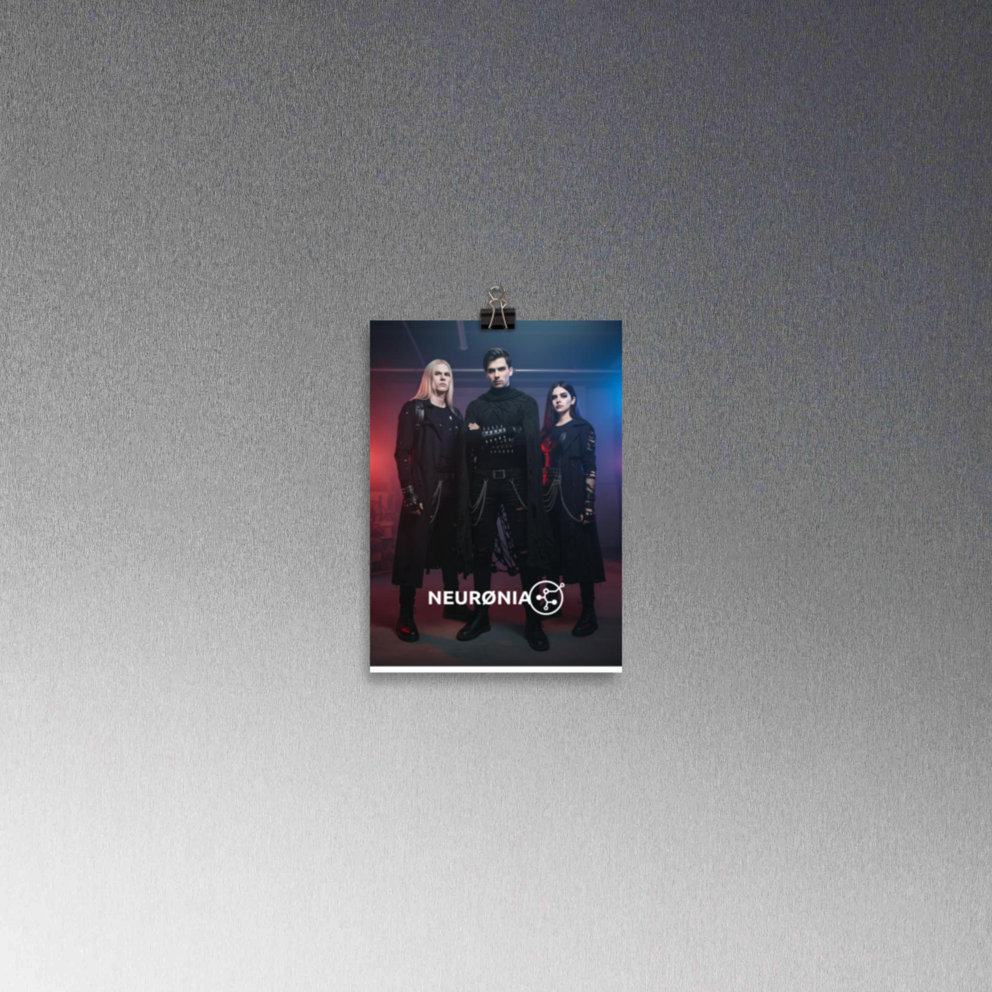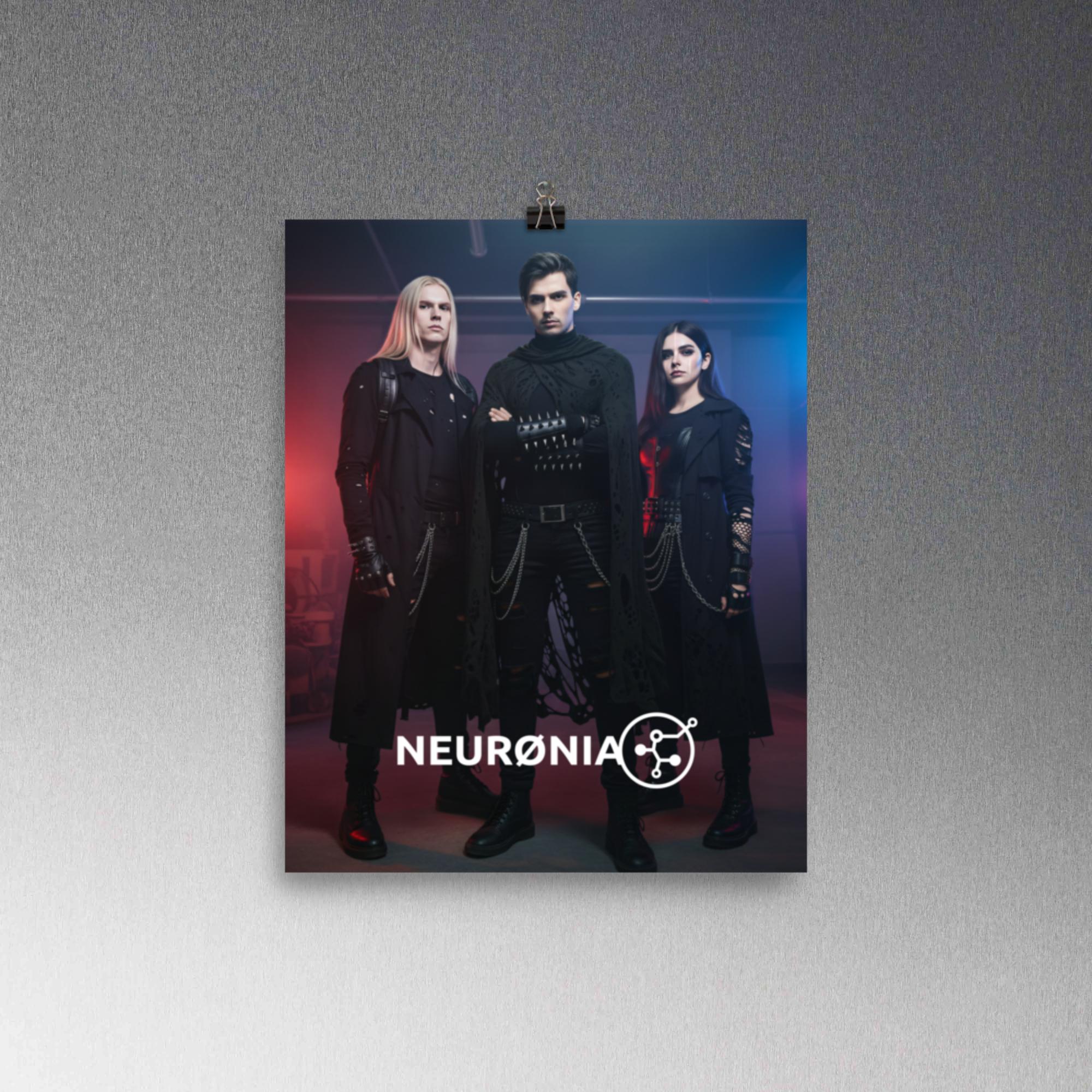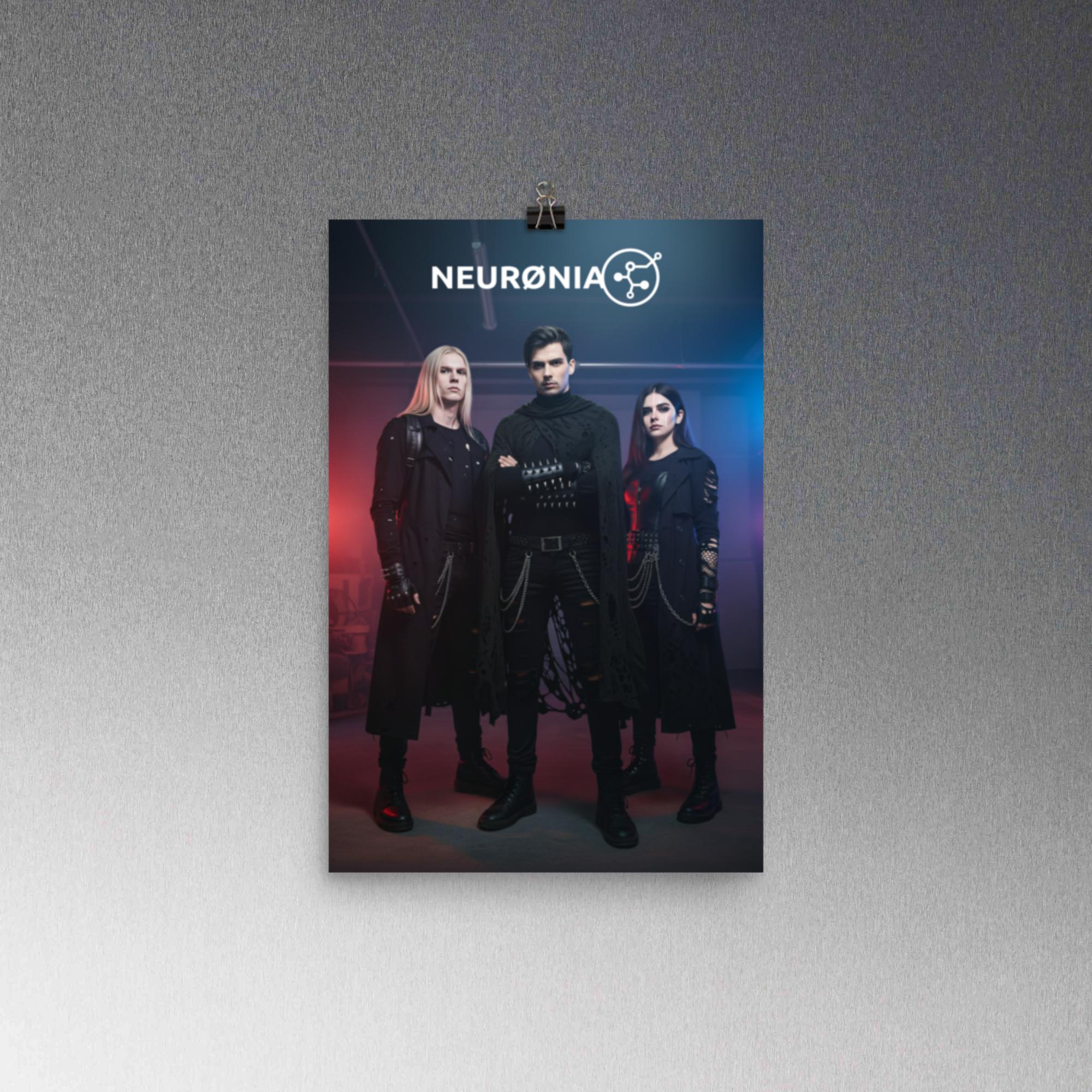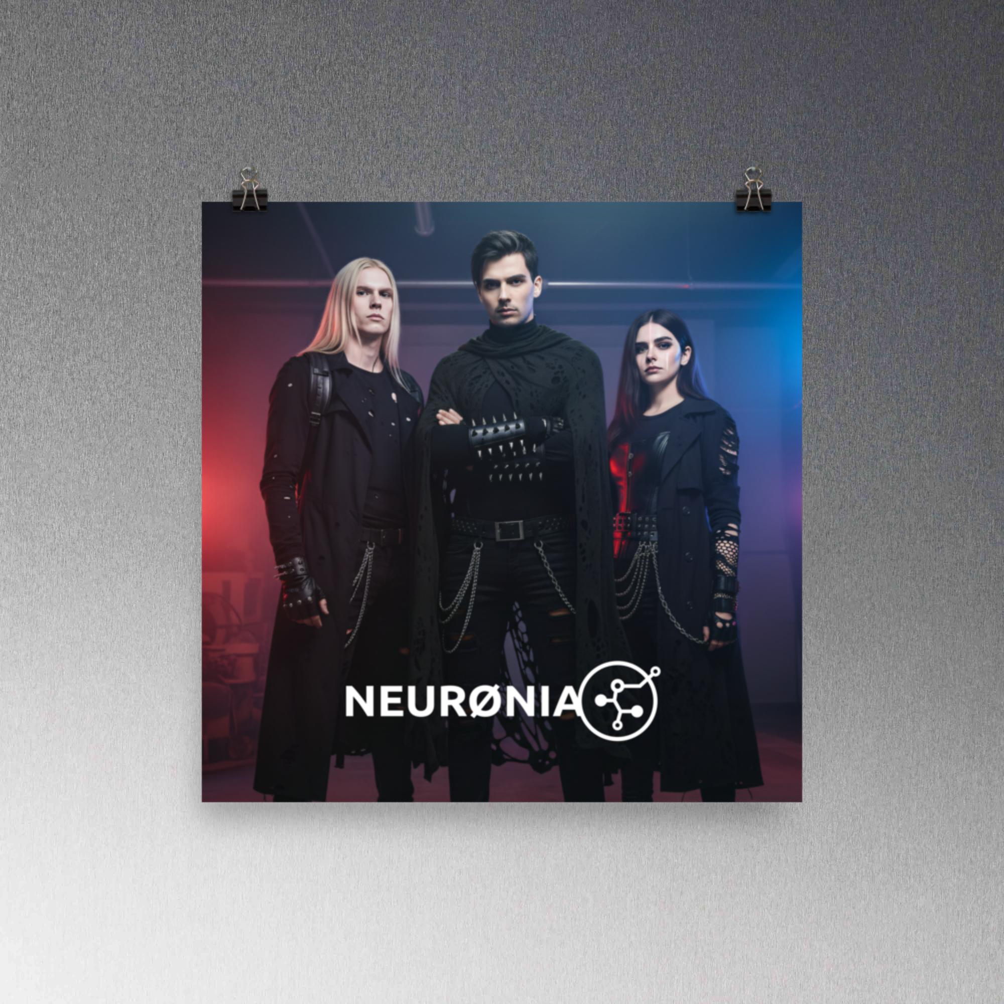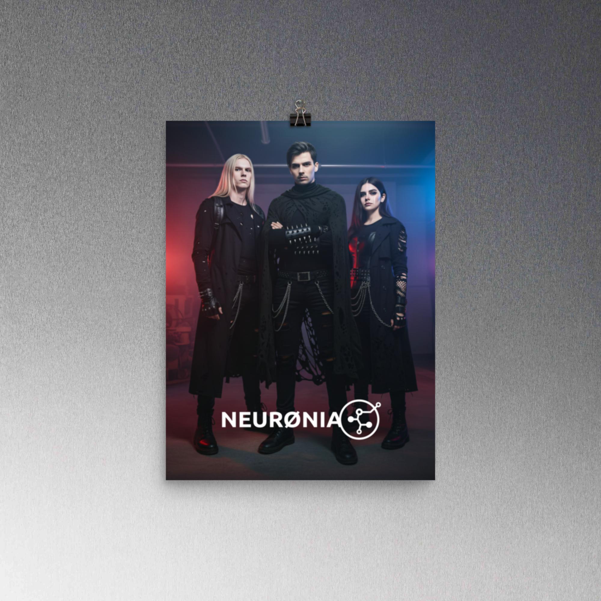 Three figures. One pulse. The Neuronia Band Poster unites Darian, Kael and Lyra— the heart of NEURØNIA — captured in their full presence: futuristic, and unbreakably focused. The image embodies the band’s essence — unity through contrast, light through shadow, and sound born from silence. A striking centrepiece for any wall.